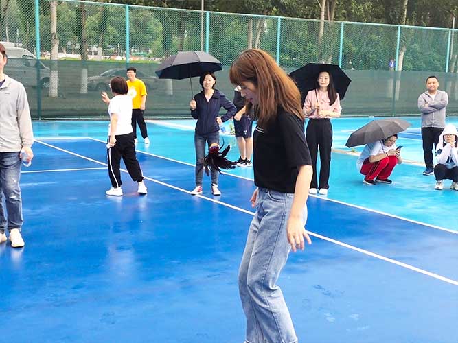 這是為女生們準備的個人賽,同理,男生也可以挑戰。參加者每人一次機會,踢毽子在不間斷、不落地的前提下,個數*多者勝利。并且冠*可以直接去選一個獎品拿走。