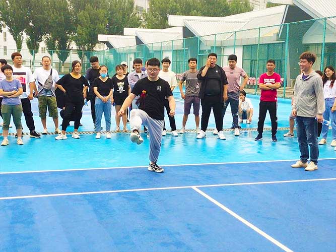 大家一排站好,從左到右,每人的右腿與另一人的左腿依次并齊,并用扁帶繩子系上,繩子綁的位置是腳踝以上部分。聽見哨聲即為游戲開始,從起點到終點,按用時由短到長,取前五名依次加分。